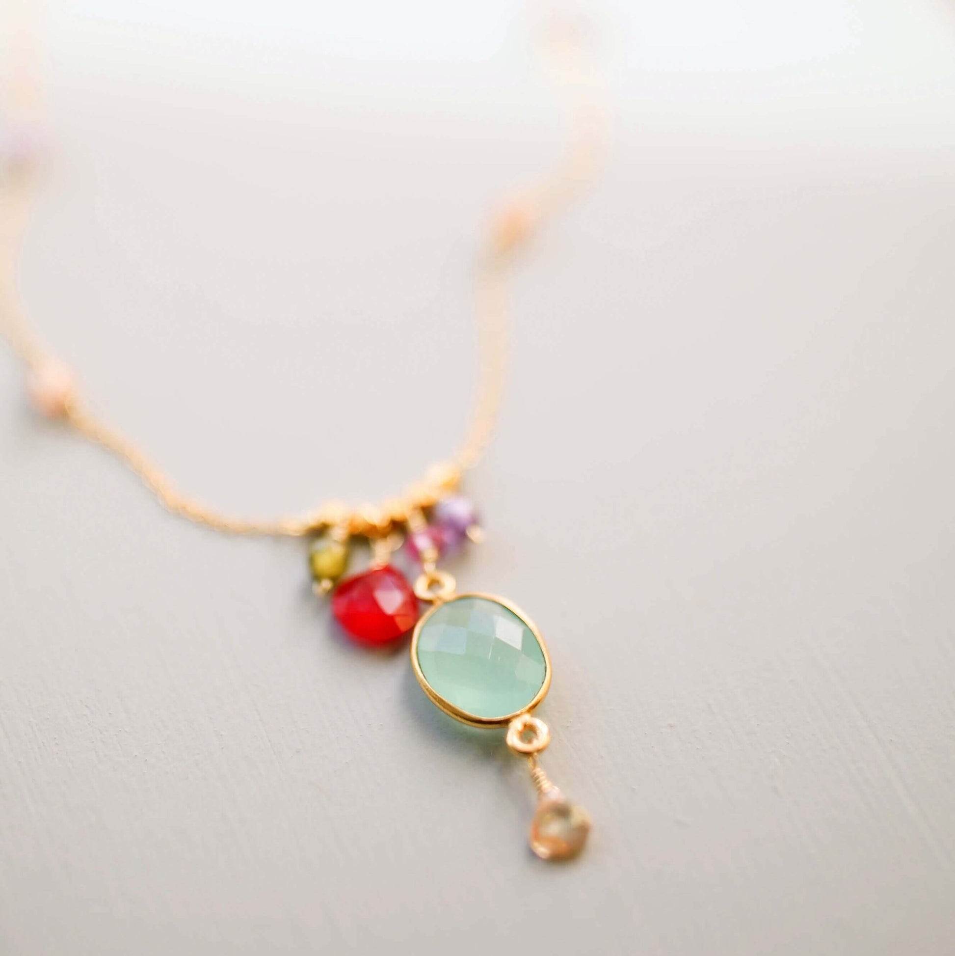 Jeweled necklace on a delicate gold chain. Beautiful bezel set blue chalcedony gemstone surrounded by ruby quartz, citrine and amethyst accent stones.