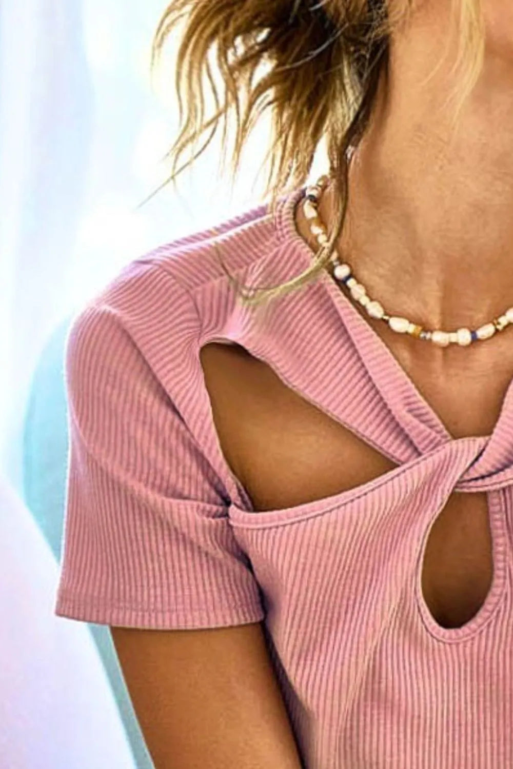 BiBi Rib Knit with Cut Out and Front Twist Detailed Top in Mauve