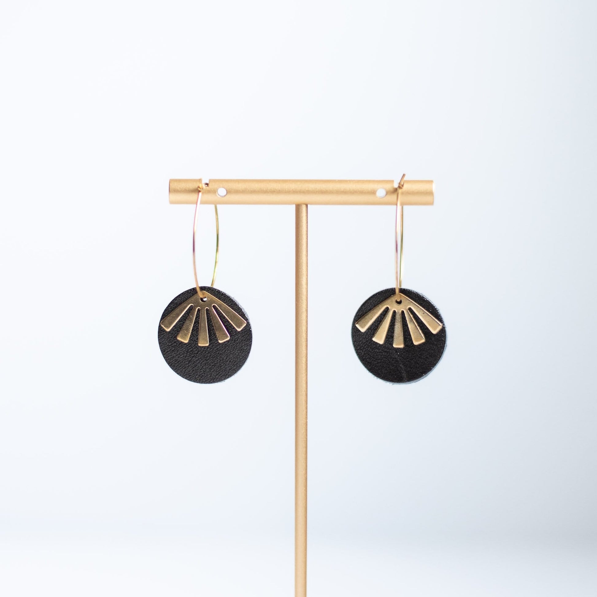Classic and elegant, the Black Oakleigh earrings are a versatile piece of handmade ethical jewelry. Rich black leather is paired with brass accents and high quality gold hoops that gently glide through the ear and fasten in the back. These are the perfect little black earrings for year-round style.