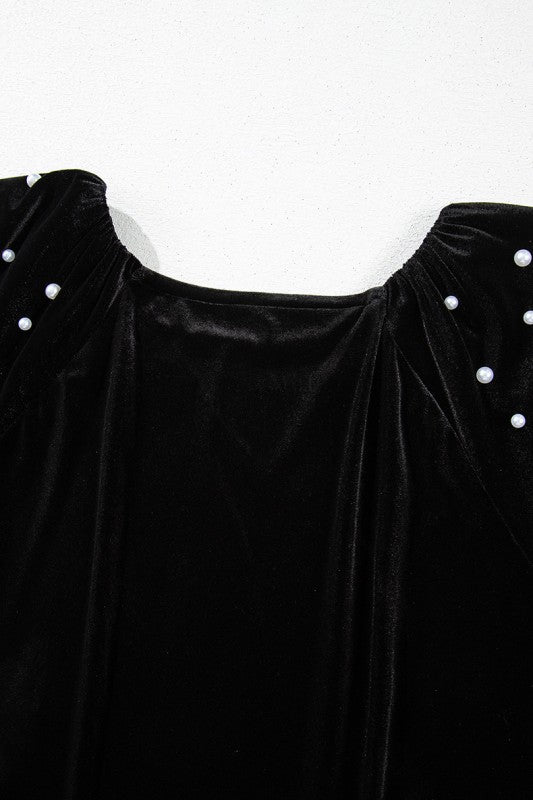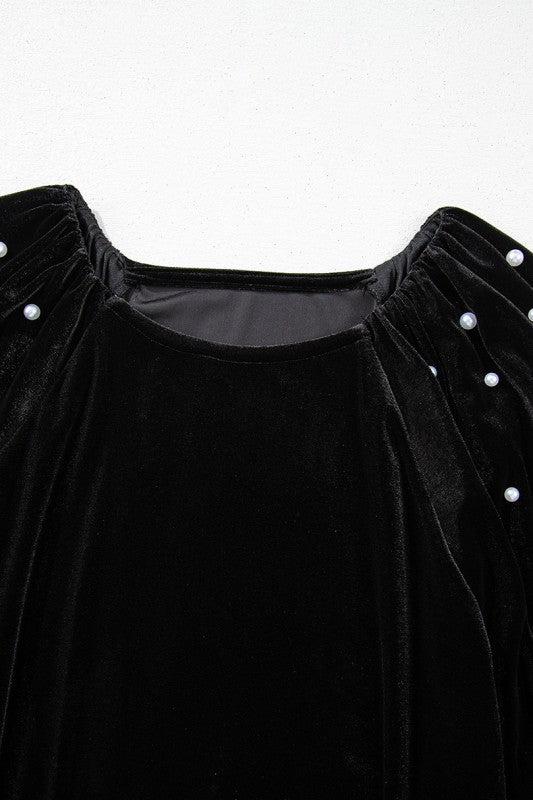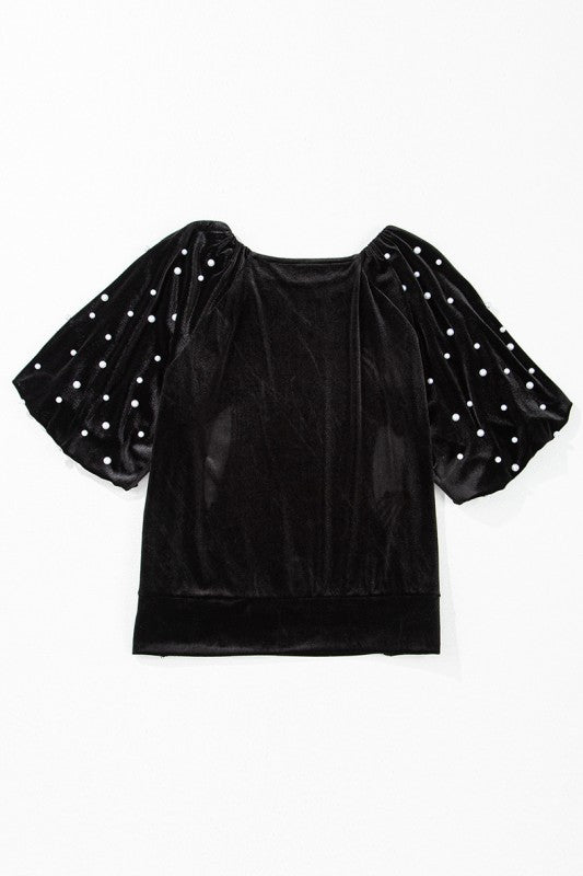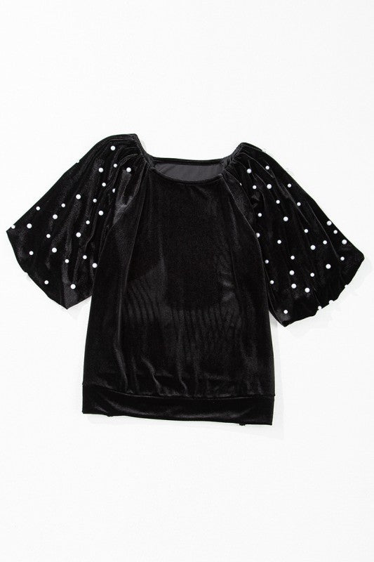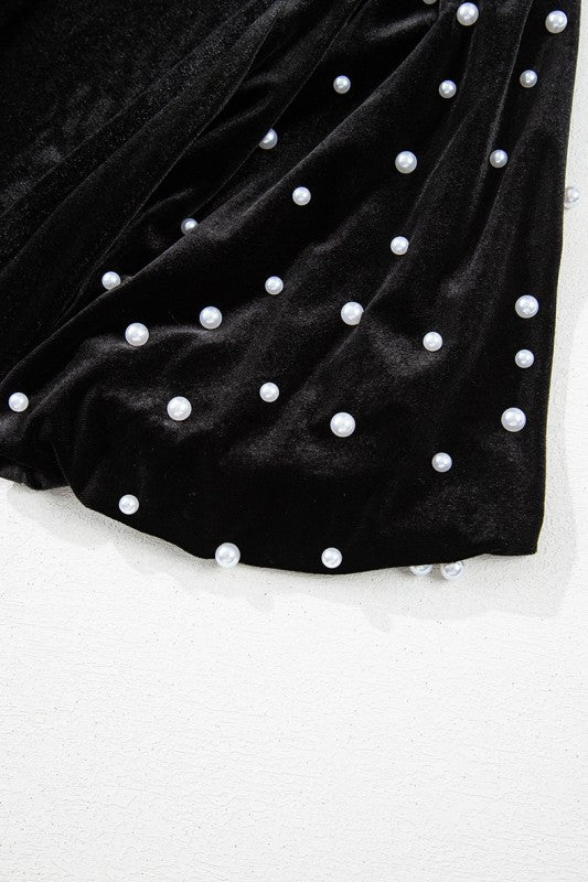 The women's top is elegantly embellished with pearl beads, adding a touch of luxury and femininity.