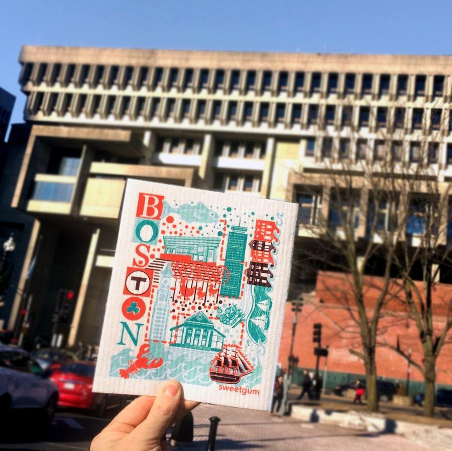 Boston is... red brick, historic buildings & seafood, winning sports teams and so much more! This Swedish dishcloth features many of Boston's landmarks: the Prudential tower, Back Bay townhouses, the Custom House Tower, Faneuil Hall Marketplace and of course Boston City Hall.