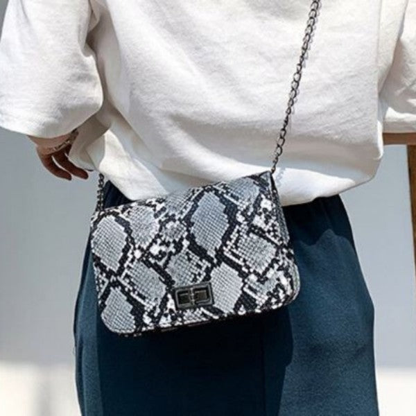 Structured snakeskin print clutch with magnetic closure flap. Vegan leather. Removable chain strap. Available in Gray, Tan, and White.
