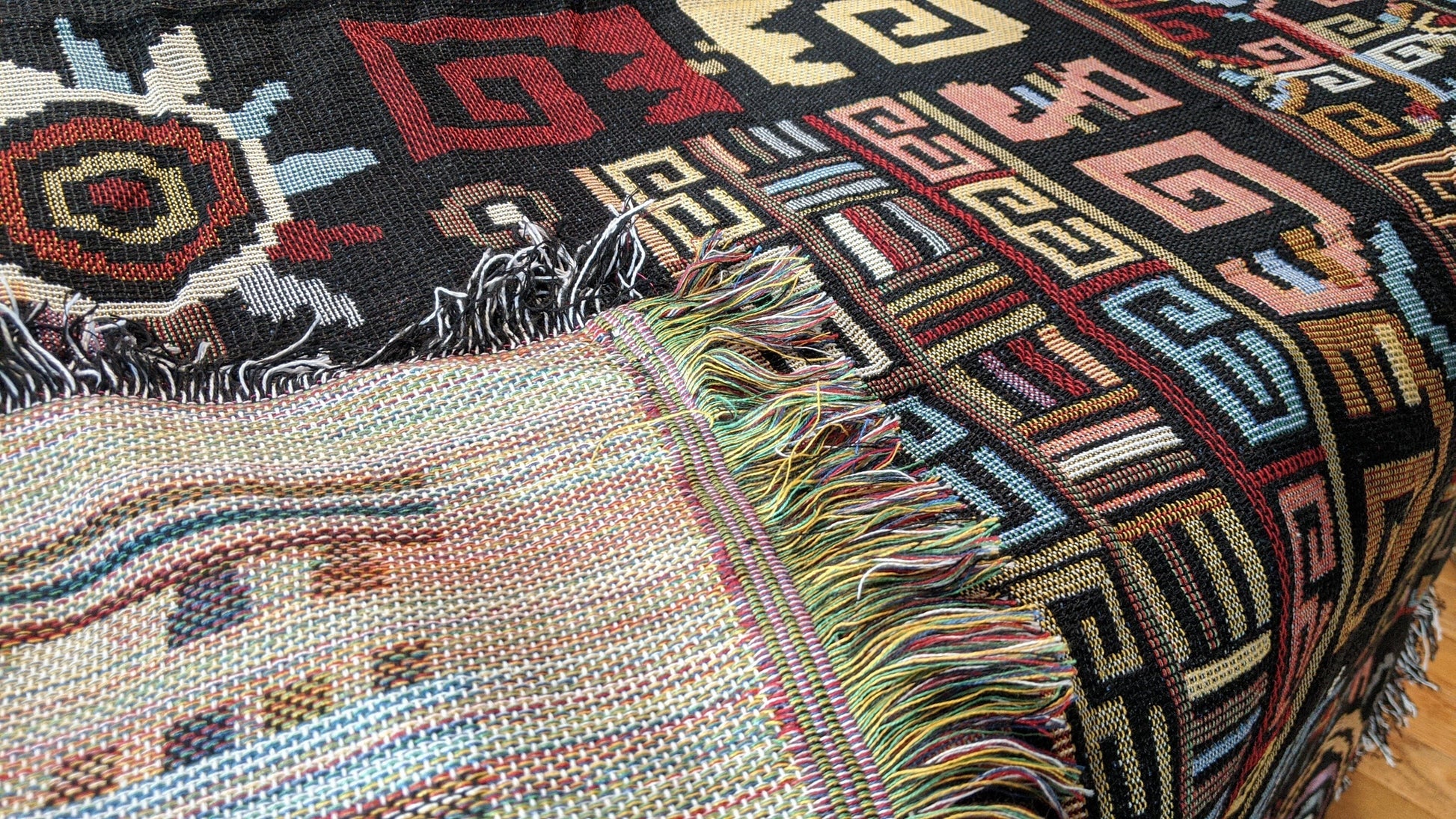 Unique with black and colorful designs on our lightweight, durable and woven tapestry throw blankets.