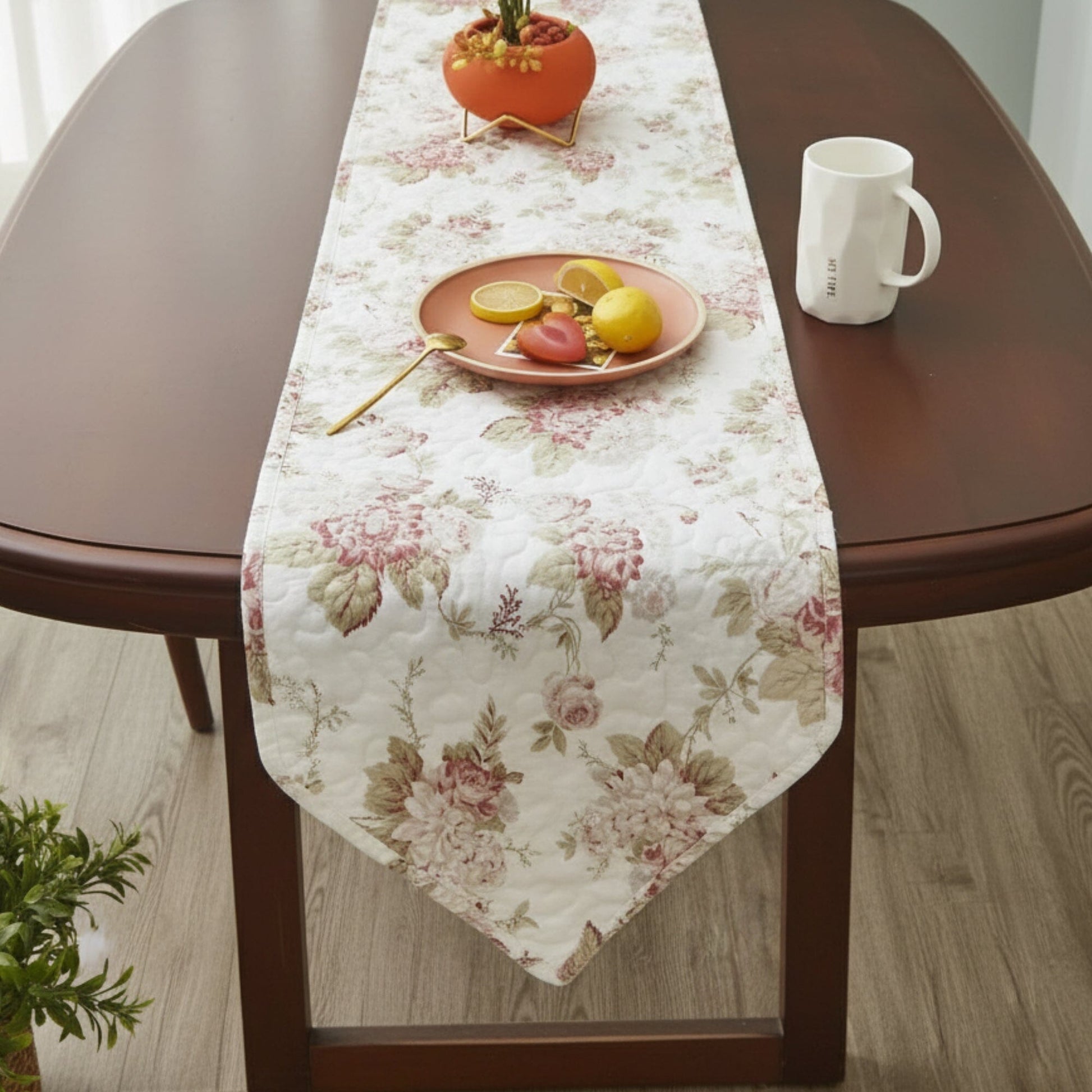 Transform your home with the romantic charm of a country garden. Our DaDalogy Bedding Hint of Mint Quilted Table Runner brings a touch of timeless elegance to any space. Featuring a beautiful print of vintage pink and red roses scattered across a soothing mint green background, this table runner is the perfect centerpiece to elevate your home decor.