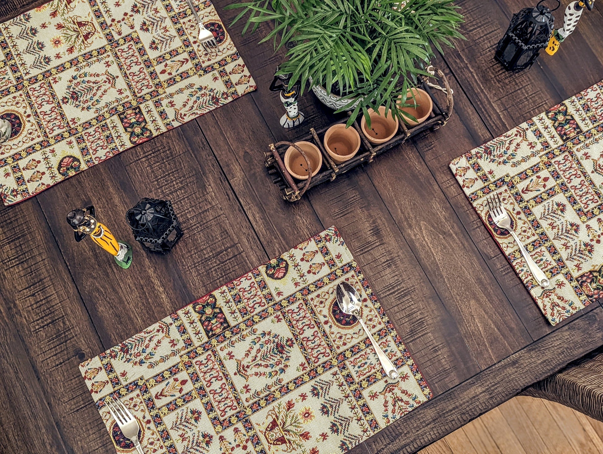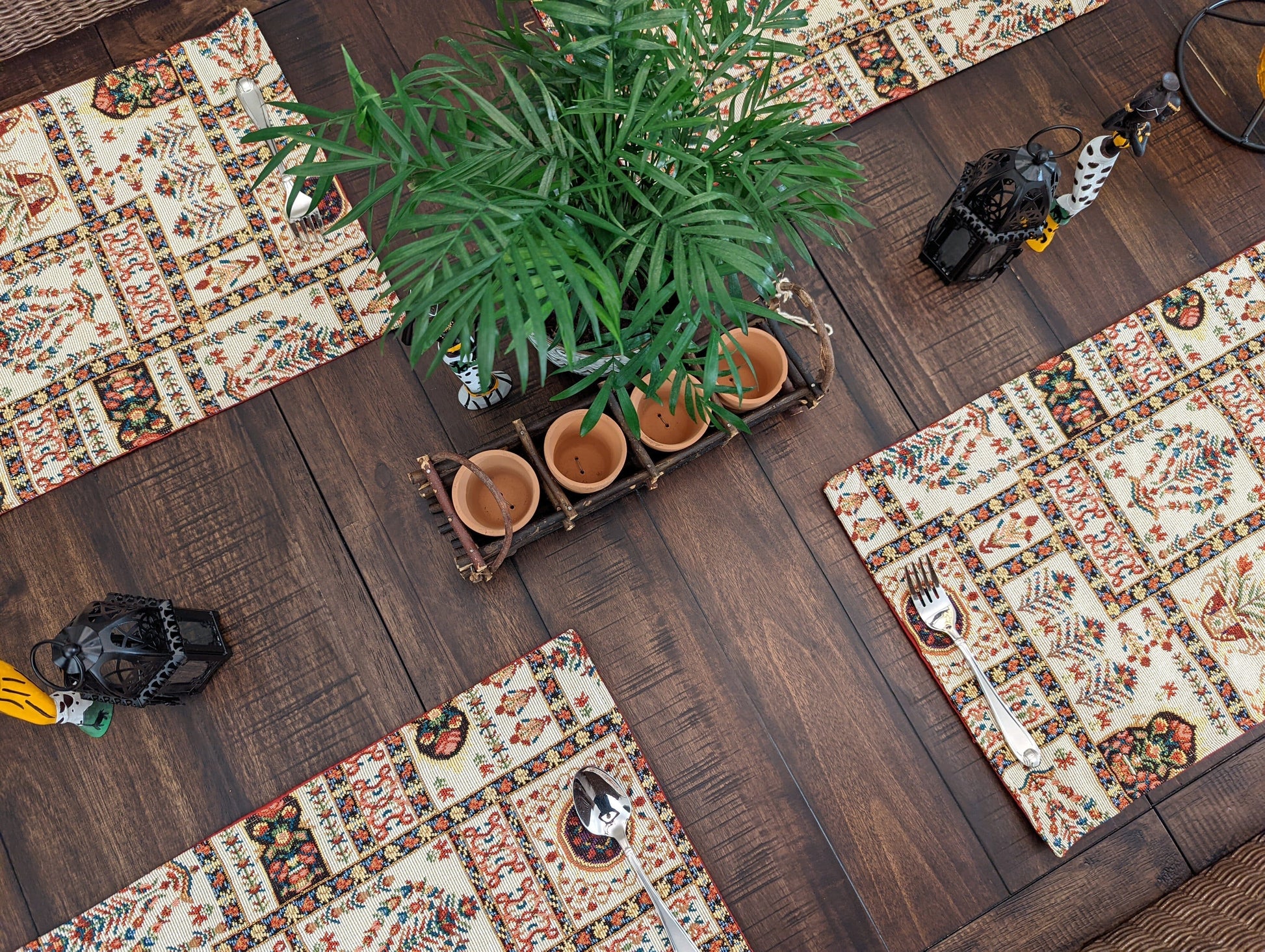 In essence, the Set of 4-Pieces Ivory Mughal Floral Tapestry Dining Table Placemats offer style, function, and durability. Their neutral color scheme and intricate floral design are versatile for any occasion and style. A perfect blend of elegance and practicality, they are a must-have for your dining table.