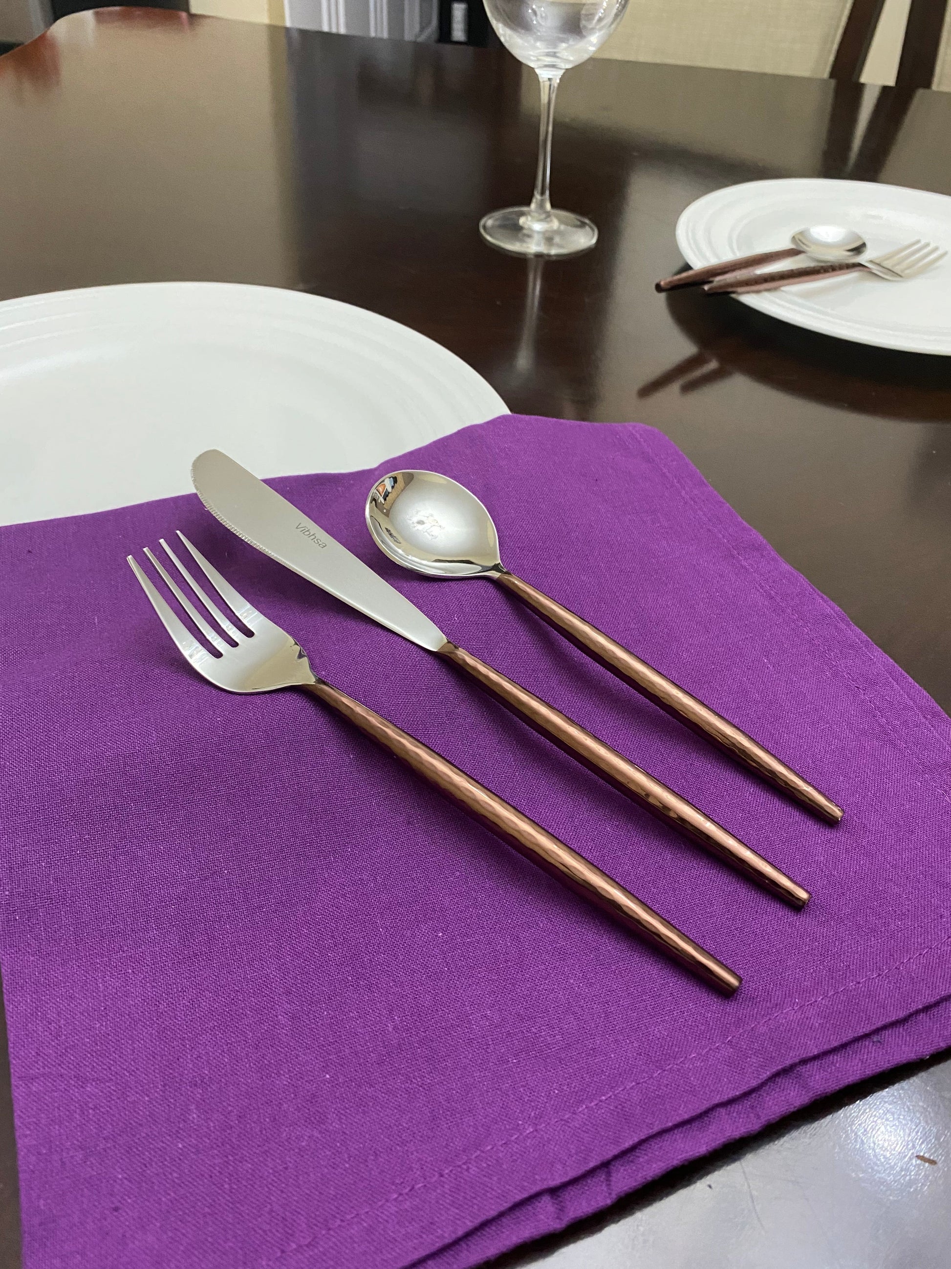 Set includes table setting for 12. Handcrafted flatware set includes 12 pieces of 9" table knife, 7" soup spoon and 7.5" dinner fork.