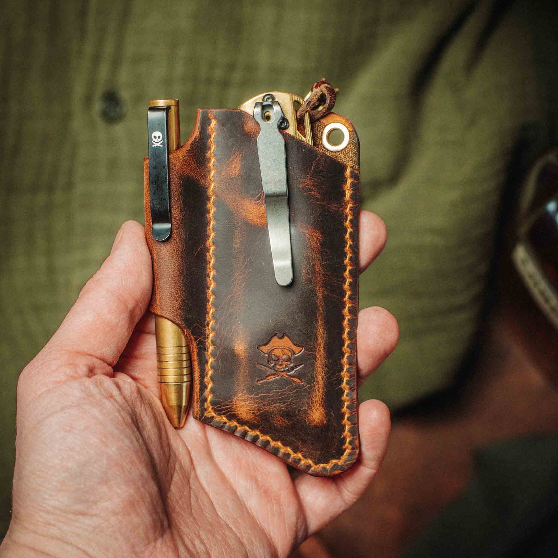 The Sailor v3 is a handcrafted leather knife sheath makes a perfect gift for men. It's a durable knife holder with a loop, designed as a pocket organizer for carrying EDC gear, and comes in black or brown leather. This premium leather EDC knife sheath has a simple goal: carry your essentials in style!