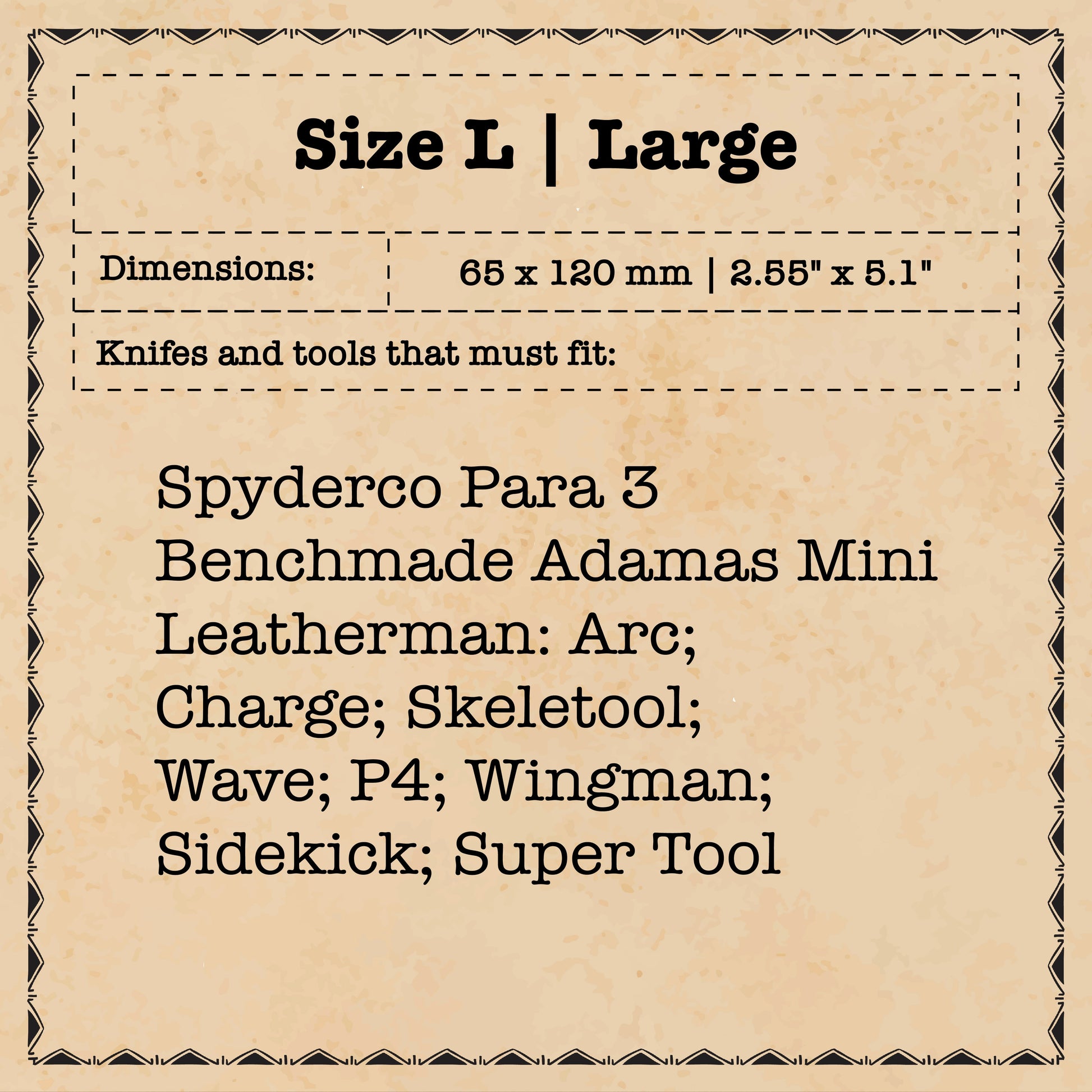 Knifes and tools that must fit: Spyderco Para 3, Benchmade Adamas Mini, Leatherman Arc, Wave, Skeletool, Charge, P4, Sidekick, Super Tool, Wingman or other in the same dimensions.
