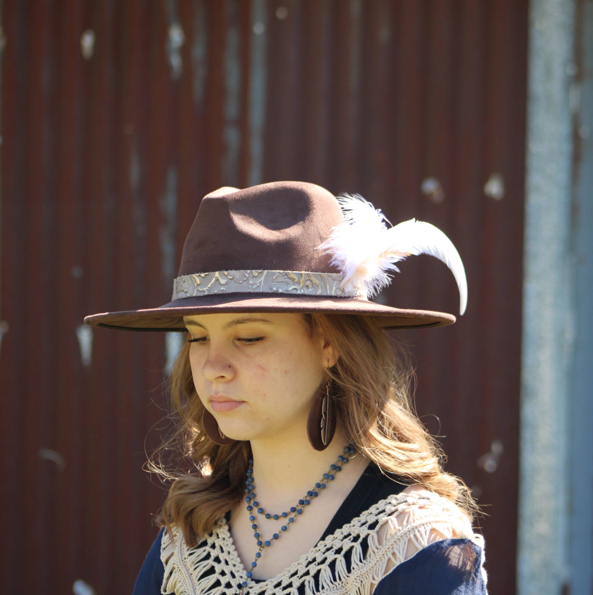 Leather Teardrop Earrings Brown w/ Copper Feather 208a