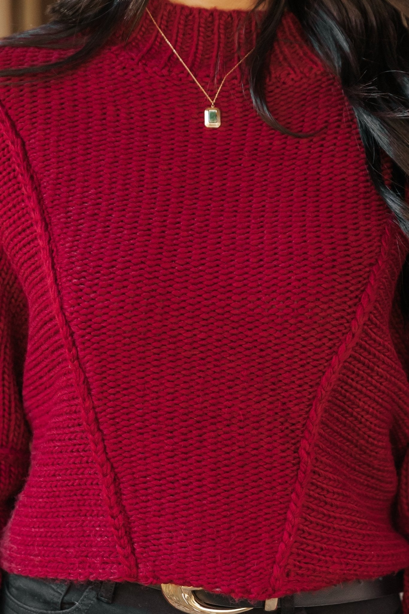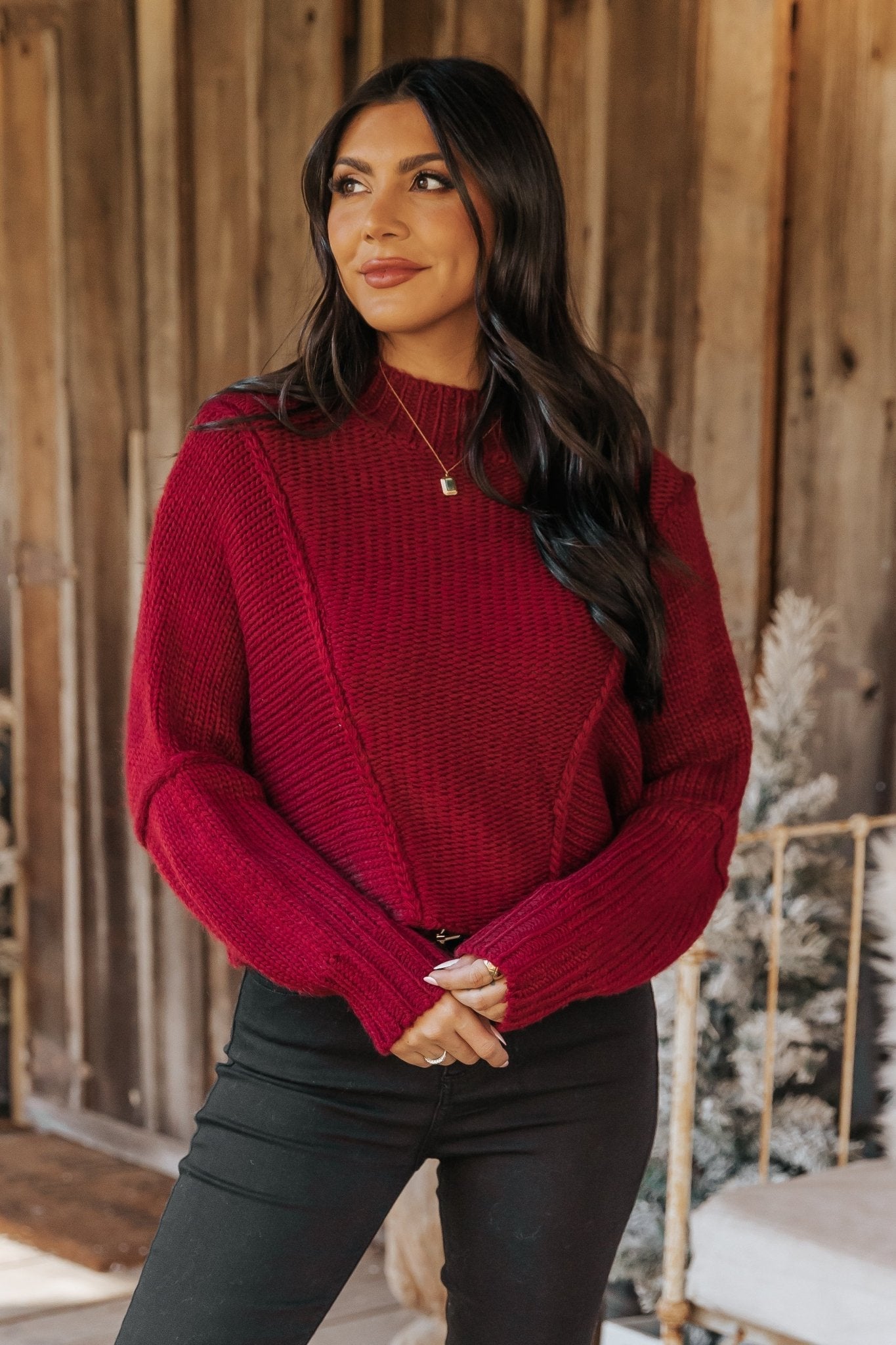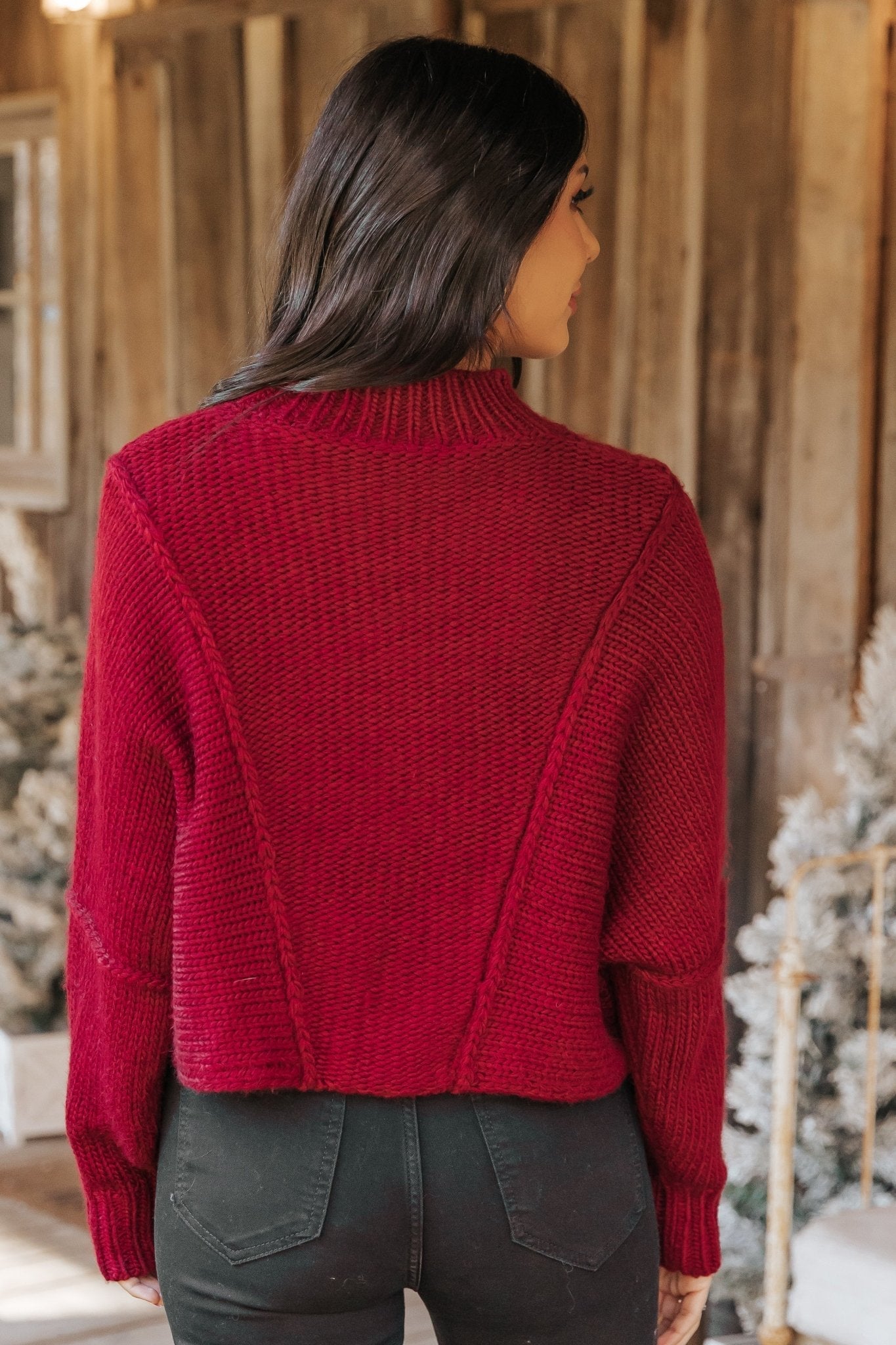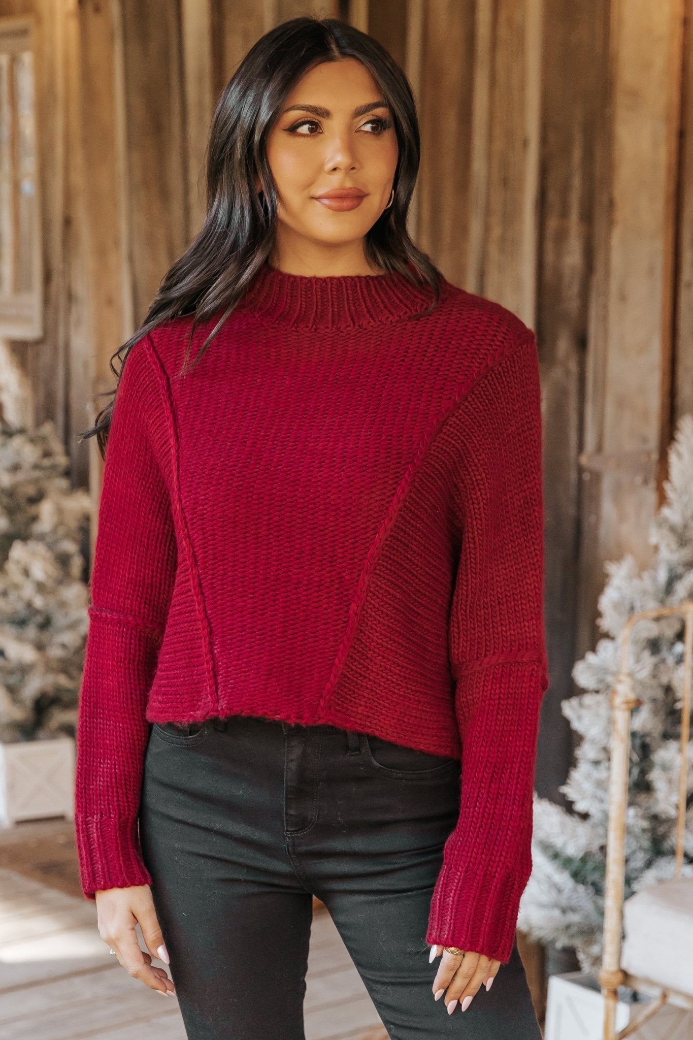 Our Seam Detail Mock Neck Sweater is a holiday-ready staple with a cozy chunky knit material!
