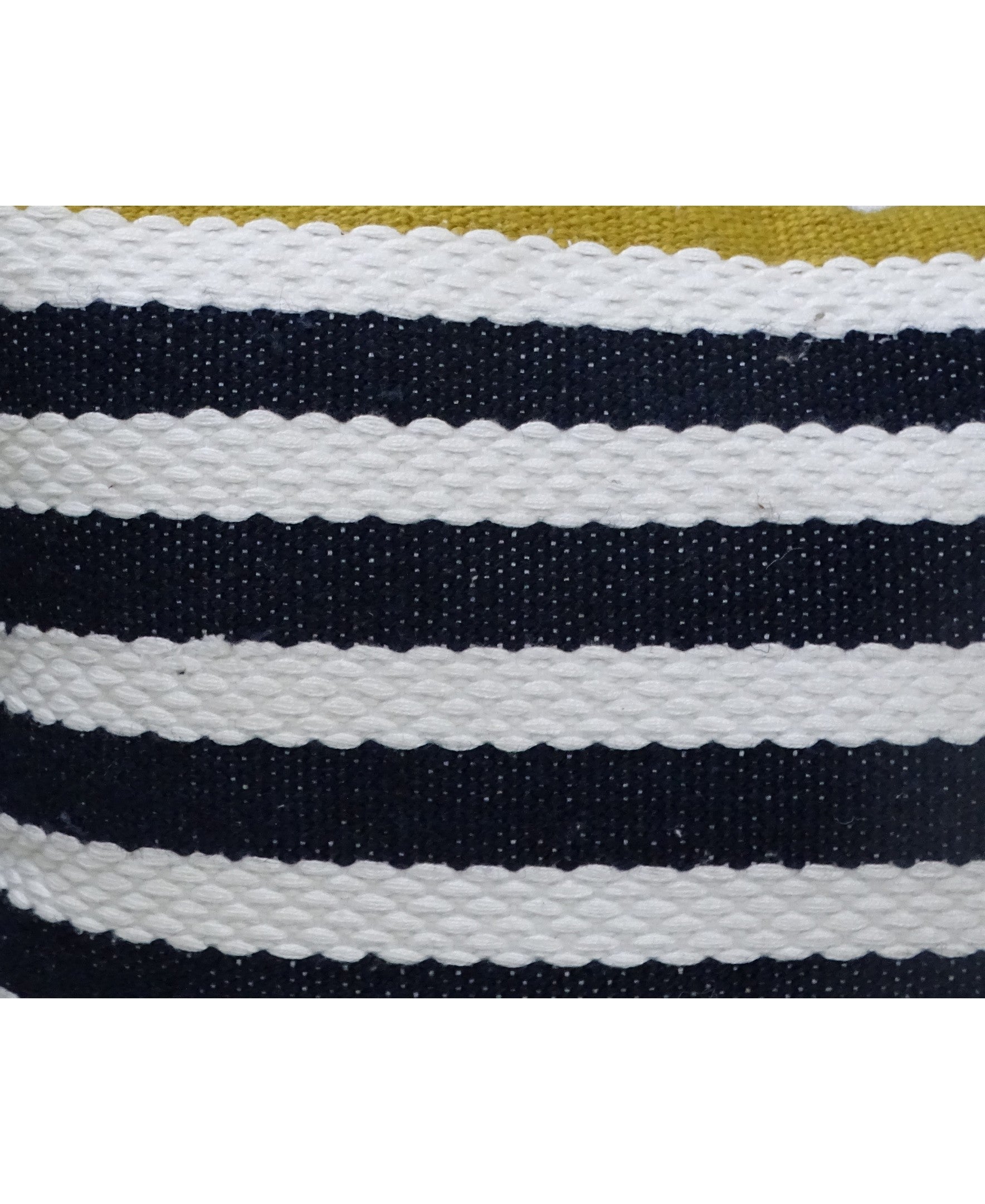14x20 in handwoven striped blue striped pillow. 100% Polyester. Includes: 1 Decorative Pillow with high quality insert. Back of the pillow has solid color with no pattern. Spot Clean only. Designed in USA. Zipper Closure for easy removal of insert. Outdoor and indoor accent pillow
