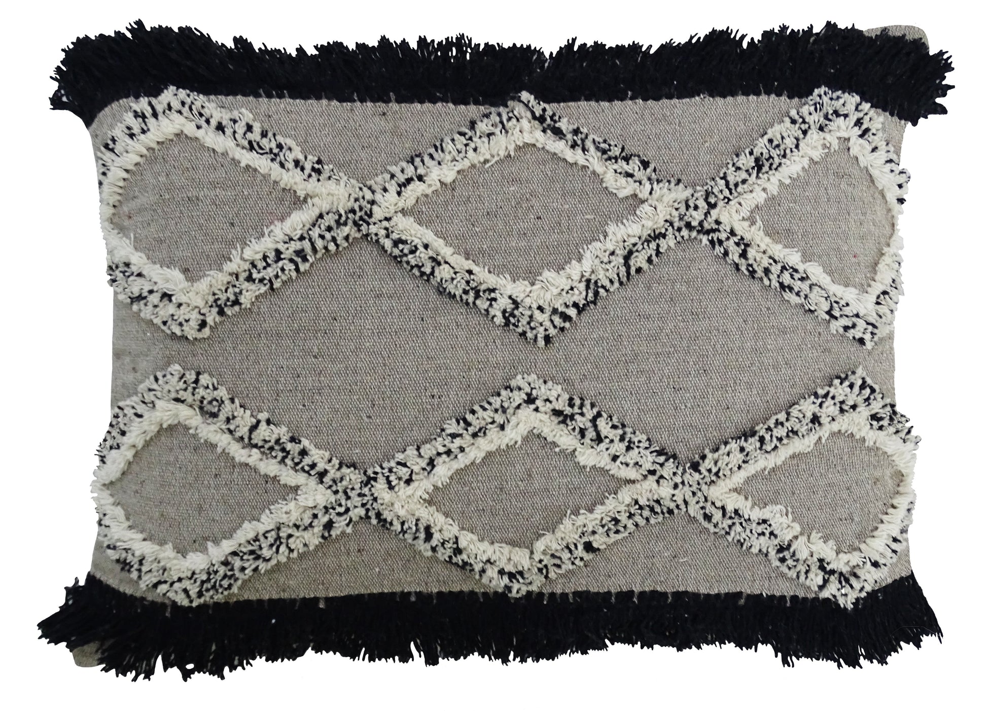 16x22 in Handloom woven accent pillow with fringes. 95% Cotton, 5% Polyester. Includes: 1 Decorative Pillow with high quality insert. Added Corner Tassels. Back of the pillow has solid color with no pattern. Spot Clean only. Designed in USA. Zipper Closure for easy removal of insert. Indoor Use Only