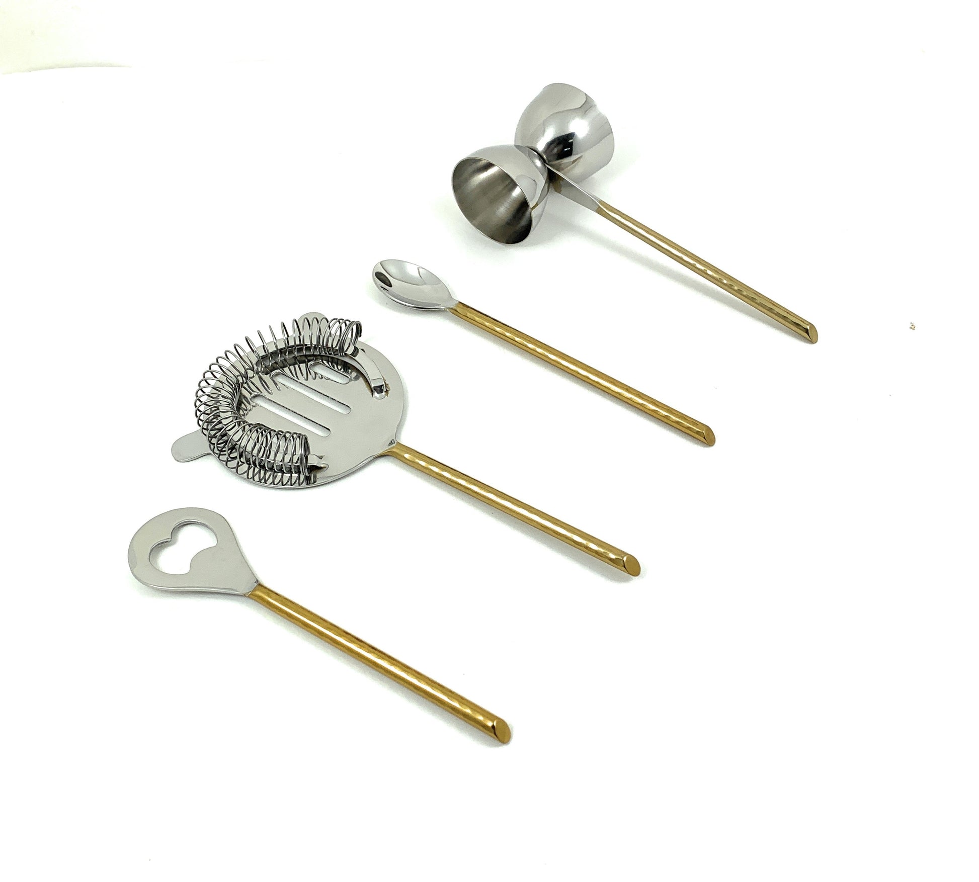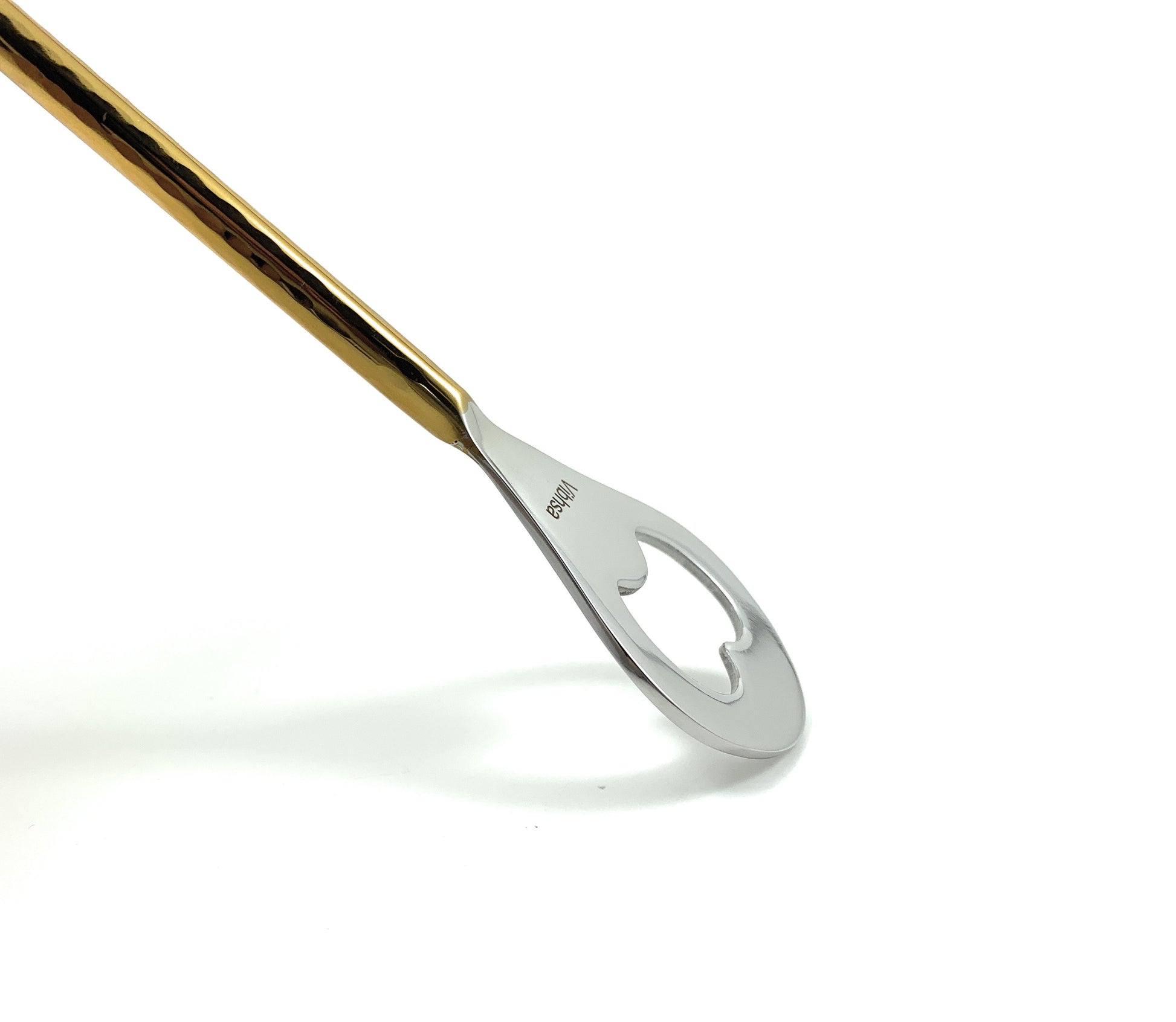 This handmade bar tool accessory is designed by artisans in silver and gold combination. The handle of these tools are hammered and has pvd coating in golden color. These are dishwasher safe and food safe.