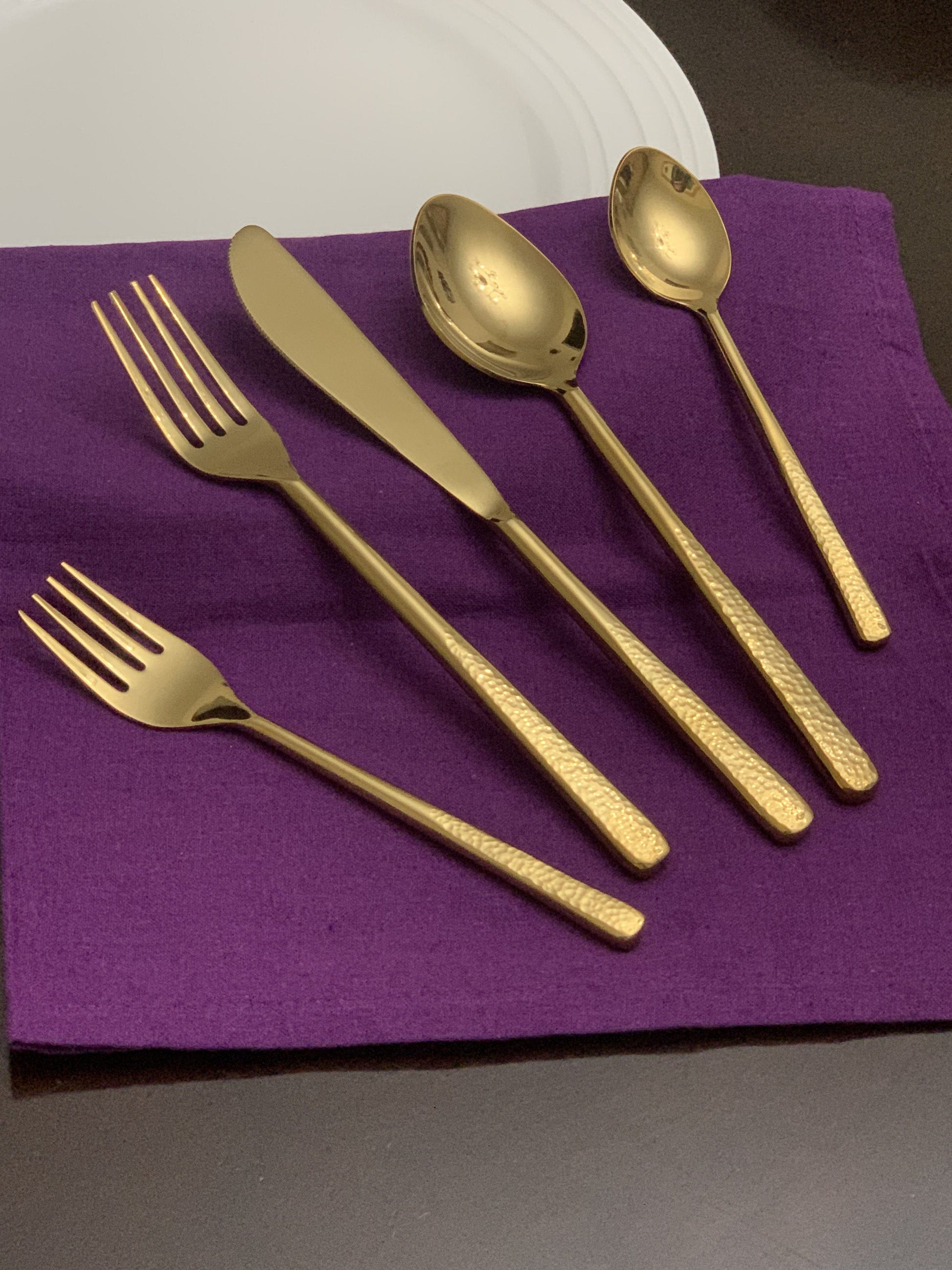 Make your dinner table setting exciting with our luxurious flatware set. Whether you are looking for gold silverware set, black flatware set or modern flatware, we have it all. Give an elegance to your dining room table settings with our artisan cutlery set in formal dinner setting or casual. A perfect stainless-steel silverware to gift. Set Includes 1 pieces of each: 8" Dinner Fork, 9" Dinner Knife, 8" tablespoon, 6" teaspoon, 6.5" salad fork. PVD coated shiny golden flatware set. Total Weight of this set is about 11 oz. Handmade cutlery set by skilled artists. Heightens the level of sophistication of your dinner table setting with this luxury silverware placement. Long lasting food safe quality, heavy and durable stainless steel provides years of use by your loved once. Dish washer safe. Top rack only. Hand wash and dry recommended for long lasting shine and polish. Do not leave flatware soaking in water after use, clean and wipe dry. Luxurious flatware set for holidays and special occasions. Comes in gift box. Perfect gift idea for Christmas, wedding, and housewarming