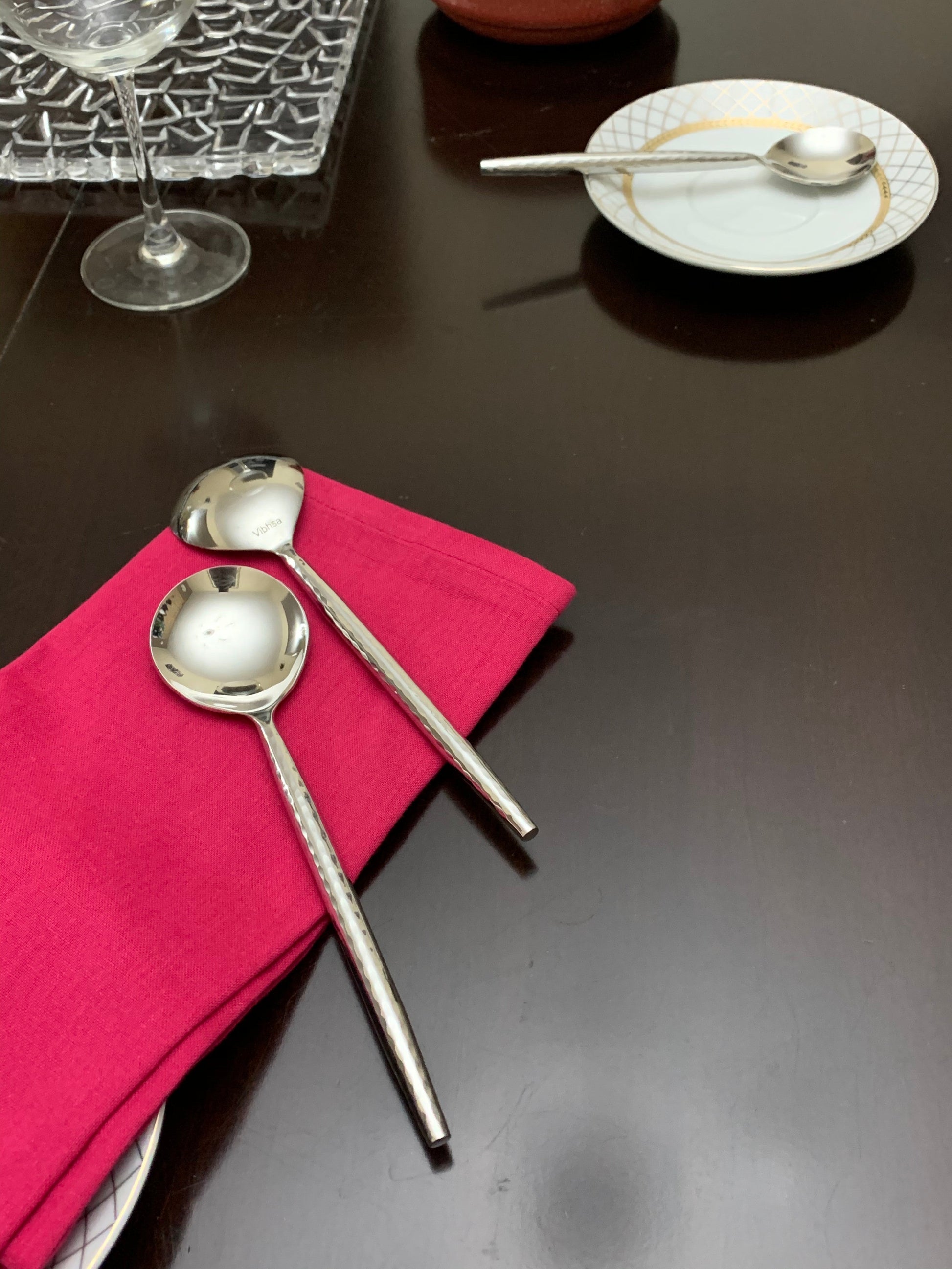 - Made by artisan Stainless Steel cutlery set. Hammered designed handle with High Gloss Finish gives a classic look to your parties