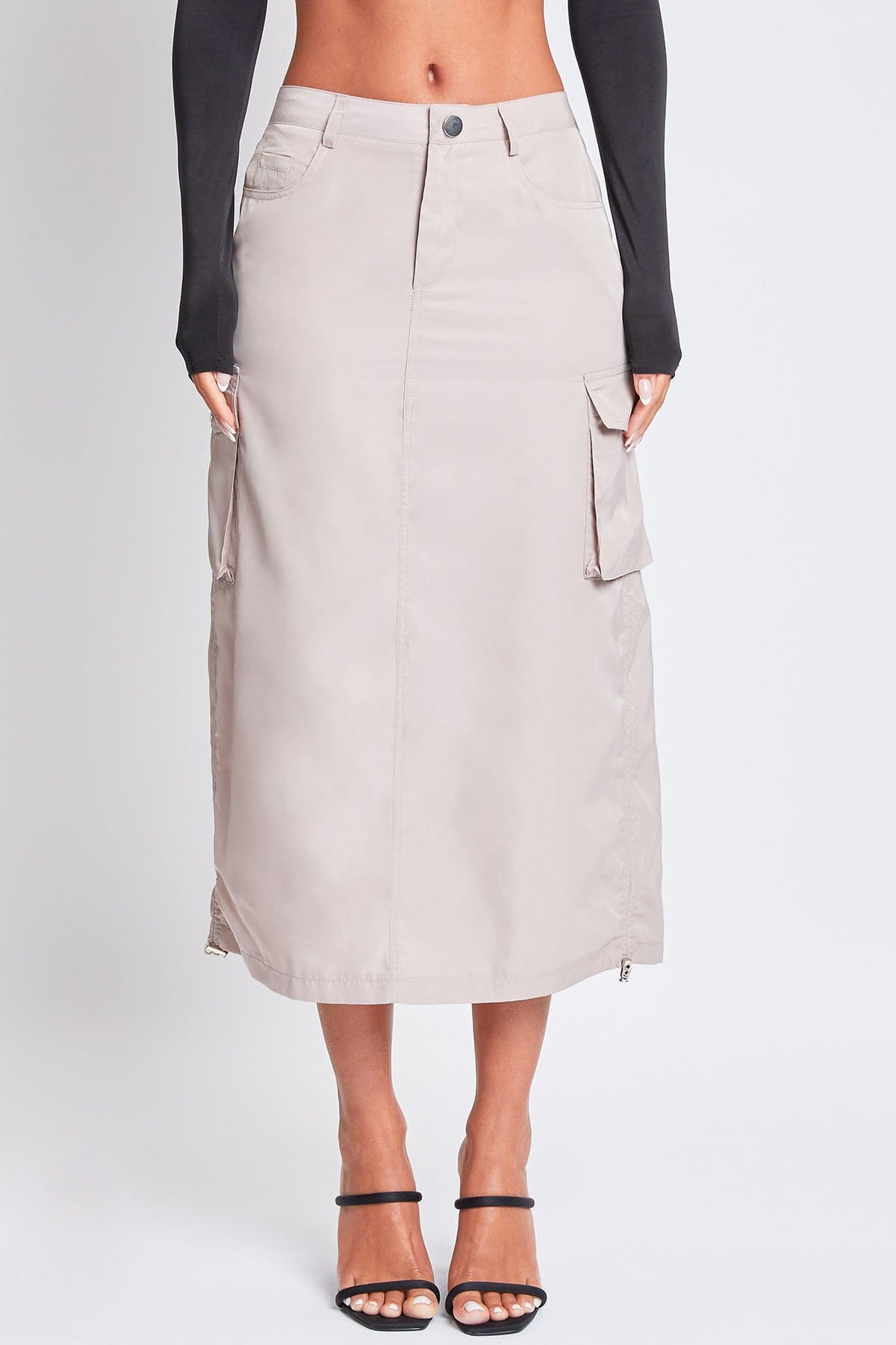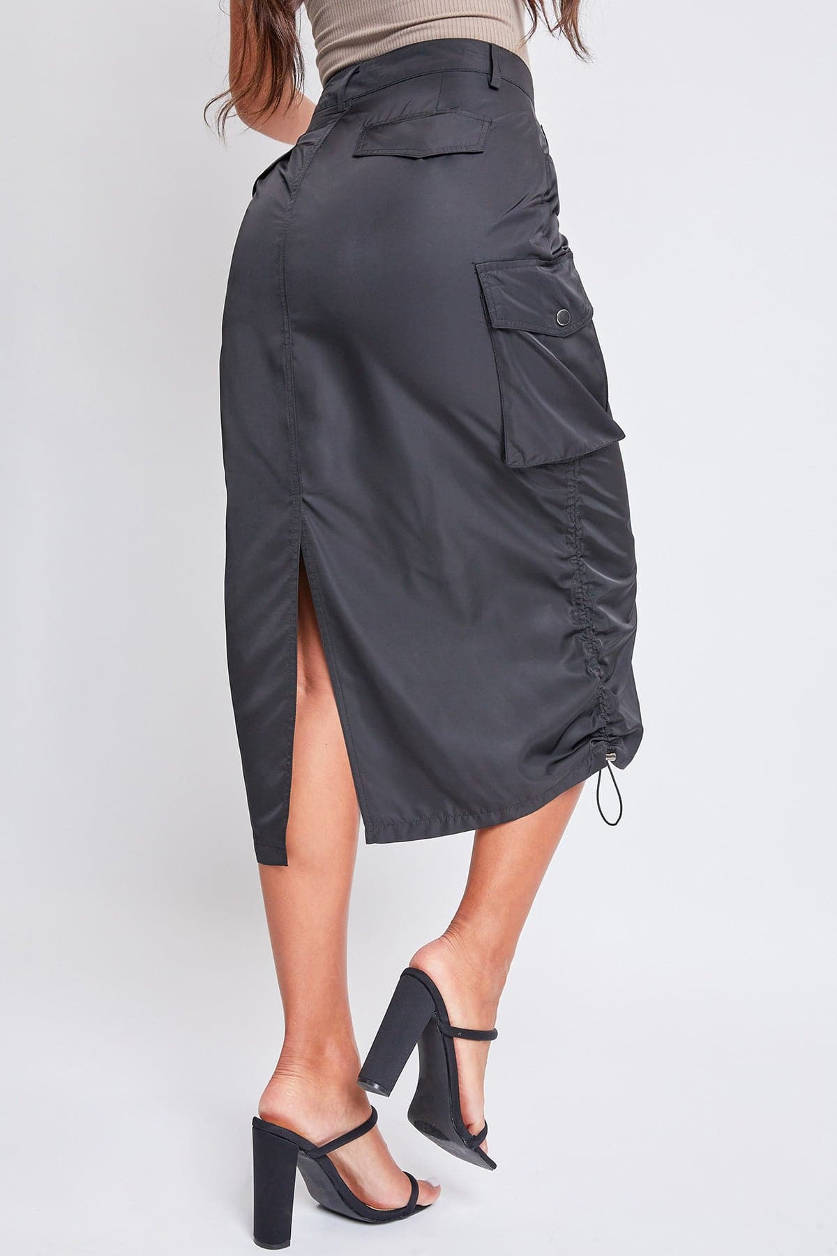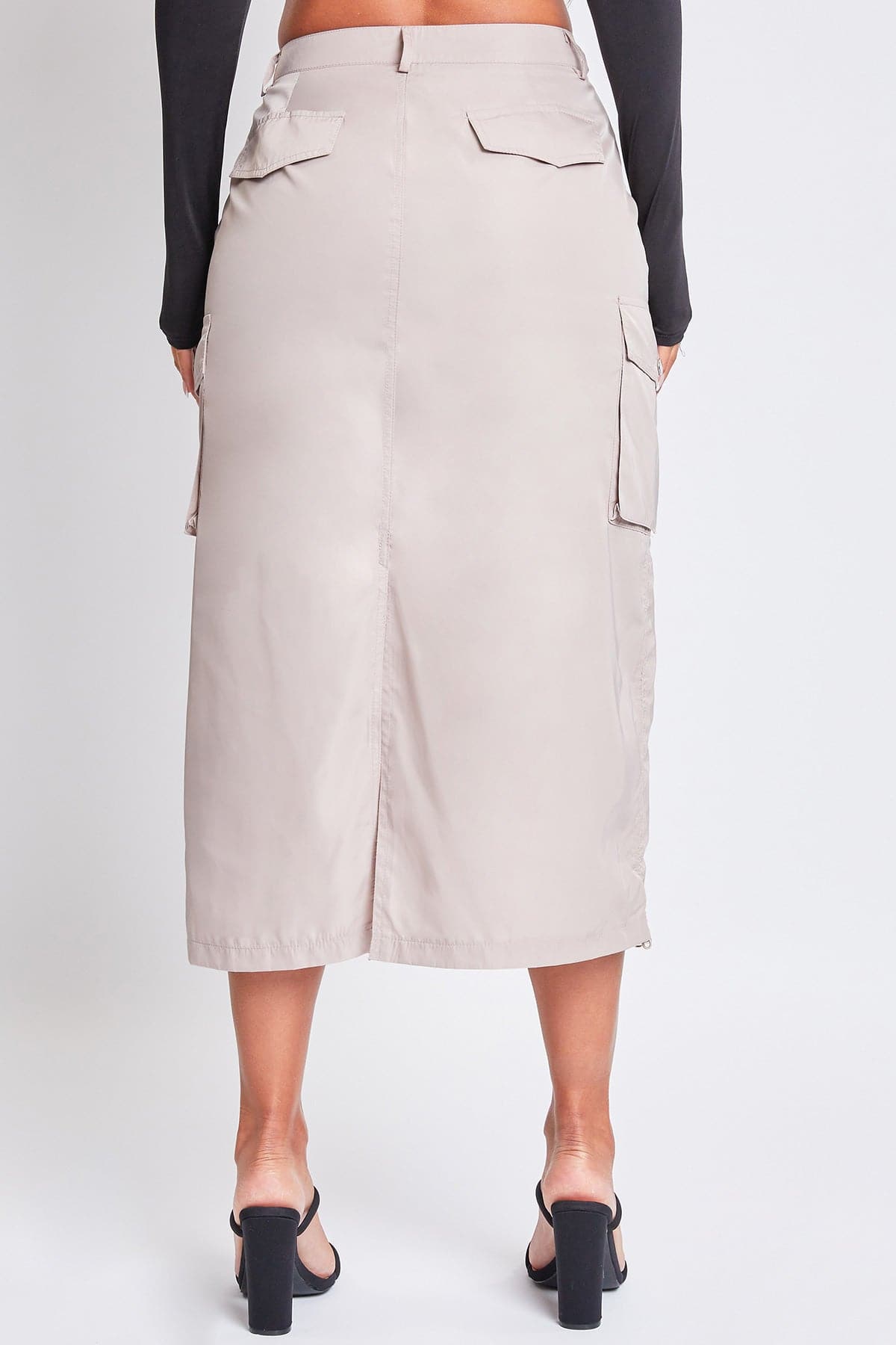 Take your style to the max with our Women’s Maxi Cargo Skirt. This trendy nylon skirt hits above the ankle for a maxi silhouette and features five-pocket styling with faux flap pockets in the back, snap button cargo pockets at the side, and a slit hem at the back for ease of movement. Detailed with bungee ties at the hem for optional ruching, belt loops, and a front zip fly with a snap button closure. Style with a fitted top and sneakers for an on-trend streetwear look we are loving right now!